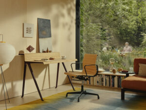 Stůl Courier v sobě snoubí dva vysoce kvalitní materiály – dřevo a hliník. Poskytuje dostatek místa na laptop, dokumenty, obrazovku i knihy, a v interiéru vynikne jako výjimečný solitér. Design Ronan Bouroullec, VITRA