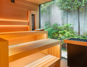 Finská sauna TAO designové řady CONTI, doplněná infrapanely s průhledem do zahrady. Foto: Aquamarine Spa