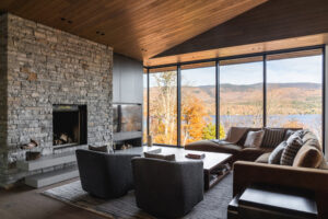 Hlavní obývací pokoj, zdobený kamennou krbovou stěnou, a zahalený do teplého dřevěného stropu, láká k odpočinku a rozjímání. Barevnou paletu designéři zcela podřídili přírodním tónům za okny. Převažuje barva dřeva na podlahách, vestavěném nábytku i obkladech stěn, sekunduje jí decentně šedá na čalounění nábytku. Výhledy na jezero Tremblant a stejnojmennou horu jsou vskutku úchvatné.
