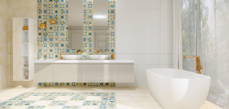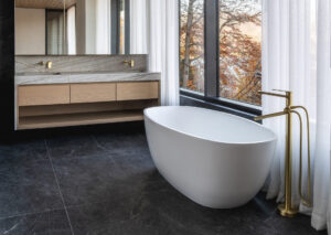 Koupelna v majitelově apartmá snoubí jednoduché tvary s luxusními materiály. Tmavý mramor na podlaze rezonuje se světlým vzácným kamenem na desce se zapuštěnými umyvadly.