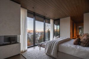 Apartmá majitele je otevřené výhledům na jezero Tremblant. Ložnice propojená s luxusní koupelnou a šatnou je vybavena pohodlnou kontinentální postelí, barvy a textury textilií dokonale ladí s vnímáním přírody kolem