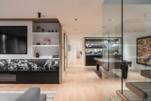 V srdci obývacího prostoru odděluje odpočinkovou část od jídelny zakázková vitrína, vytvářející intimní zákoutí. Dekorativní prvky čerpají z teplých, organických tónů lesů okolních Laurentinských hor. Strop, kompletně obložený dřevem, sleduje složitou triangulaci, která moduluje vnitřní objem. Nad obývacím prostorem je nižší a útulnější, postupně stoupá nad kuchyní a vrcholí dramatickým střešním oknem.