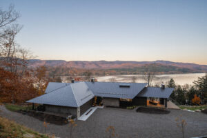 Rezidence volbou materiálů a barevnosti splývá s okolní přírodou. Pilovité střechy pokryté tmavou břidlicí z nadhledu ladí s potemnělou hladinou jezera.