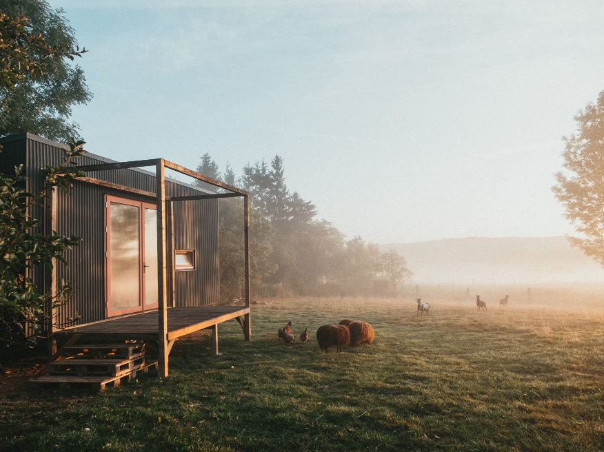 Dispozičně dům navazuje na tradiční trojdělení venkovských domů. Vstupuje se do něj ze dvora, od jihu. Vzhledem k současným nárokům na užívání a provoz v domě dochází k částečné proměně náplně a proporcí jednotlivých dílů dispozice. Denní obytná místnost je v části své půdorysné plochy otevřena do podkrovního prostoru. Předpokládáme, že vertikalita a různé typy a intenzity denního světla, dodají společenskému prostoru jistou svátečnost. Zároveň tím v podkrovním dětském pokoji vznikají (ještě za pomoci komínu, který prostorem prochází) zákoutí s proměnlivou intenzitou osvětlení – od jasných míst až po tmavé kouty. Mysleli jsme tu na dobrodružství a atmosféru starých půd. Dvůr před domem přecházející plynule v sad je vymezen dřevěným hospodářským stavením (skladování, dílna, sušárna, venkovní kuchyně…). V jižní části pozemku jsme se stavebníkem v průběhu stavby nalezli vhodné místo pro jednoduchý zakopaný sklep (ovoce, víno) a seník. V severozápadní části zahrady se pak chystáme na malý ovčín.