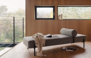 Moderní lenoška Quilton Lift Daybed díky polohovatelnému opěradlu a kvalitnímu čalounění Flamiber A5 nabízí flexibilní využití od relaxace přes čtení až po elegantní doplněk obývacího pokoje. DESIGN VILLE
