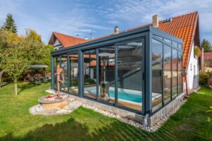 Moderní zimní zahrada propojená s bazénem nabízí nejen celoroční relaxaci, ale i estetický zážitek. Skleněná konstrukce chrání před nepřízní počasí, zatímco stylové prvky jako stará pumpa dodávají prostoru nostalgický šarm. HOBBYTEC