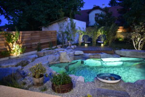 Aby vodní prvky skutečně vynikly, je dobré věnovat pozornost i jejich vizuálnímu a akustickému doprovodu. LED podsvícení zabudované pod hladinu jezírka nebo za fontánovou stěnu vytváří magický efekt, zejména při stmívání. Reflektory s možností stmívání a dálkového řízení umožňují měnit atmosféru podle situace: jemně při večerním posezení, dynamičtěji při slavnostní akci.